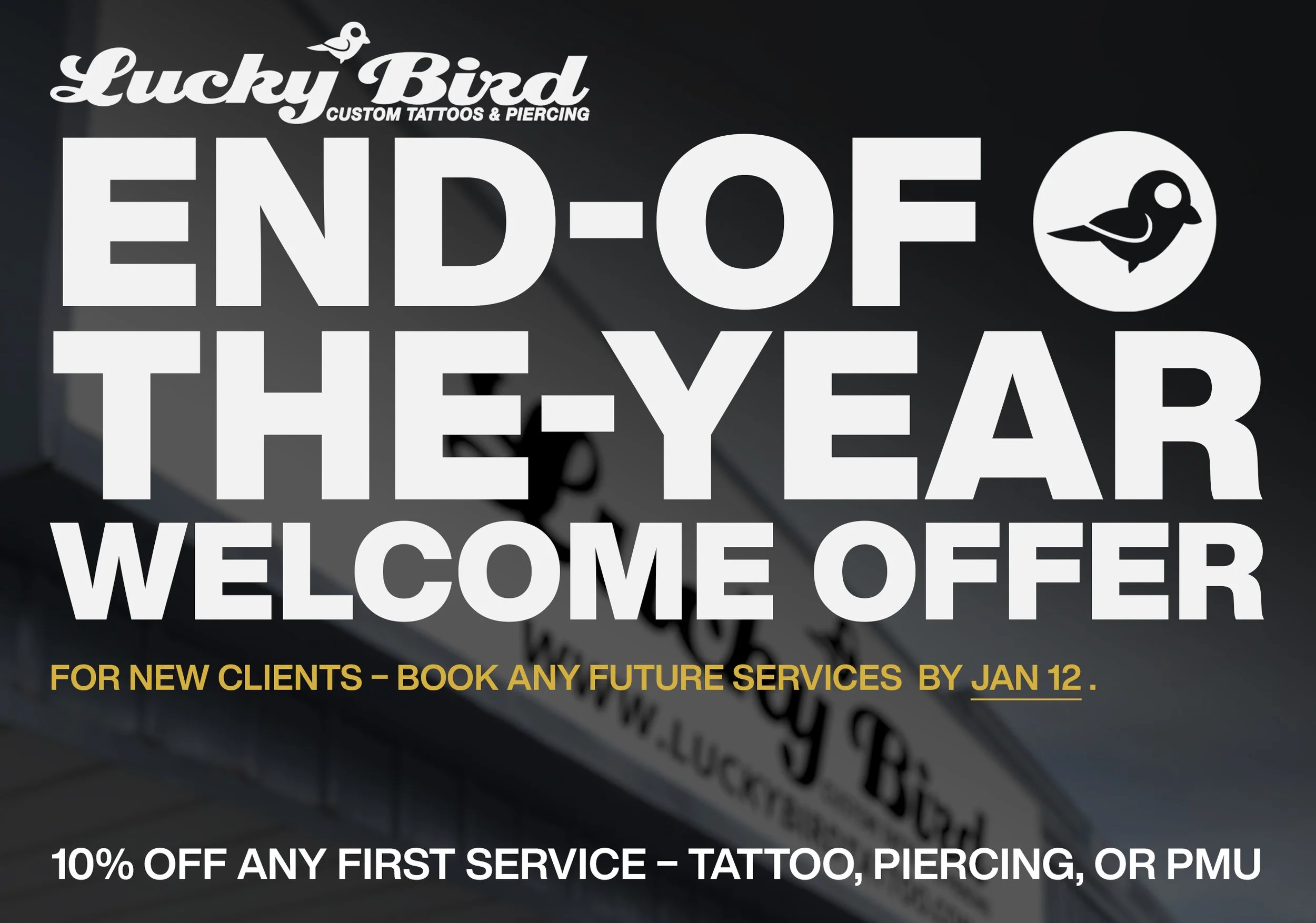 As we close out another busy year at Lucky Bird Tattoo, we’re excited to introduce a new seasonal offer designed especially for anyone who hasn’t visited us yet. From December 1 through January 12, new clients will receive 10% off their first service — whether it’s a tattoo, piercing, or PMU appointment.